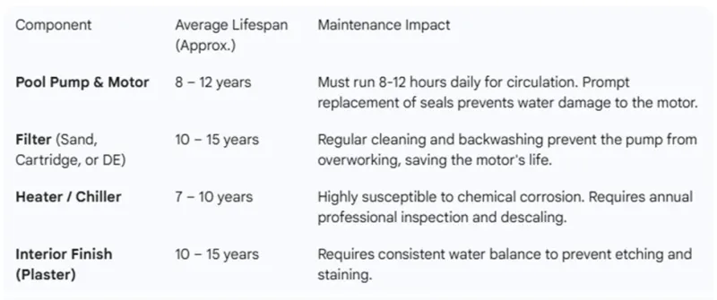 The surrounding machinery is the “heart and lungs” of your pool and will require replacement well before the pool shell. Consistent professional maintenance is key to extending the life of these costly components:
